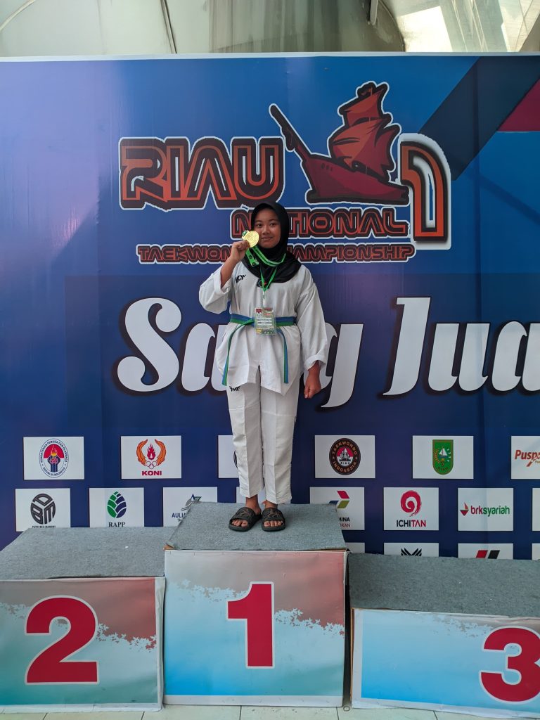 Alyshia Rahayu Rahma, Siswi SMA Negeri 19 Pekanbaru berhasil mendapatkan Juara 1 meraih Medali Emas di Riau National Taekwondo